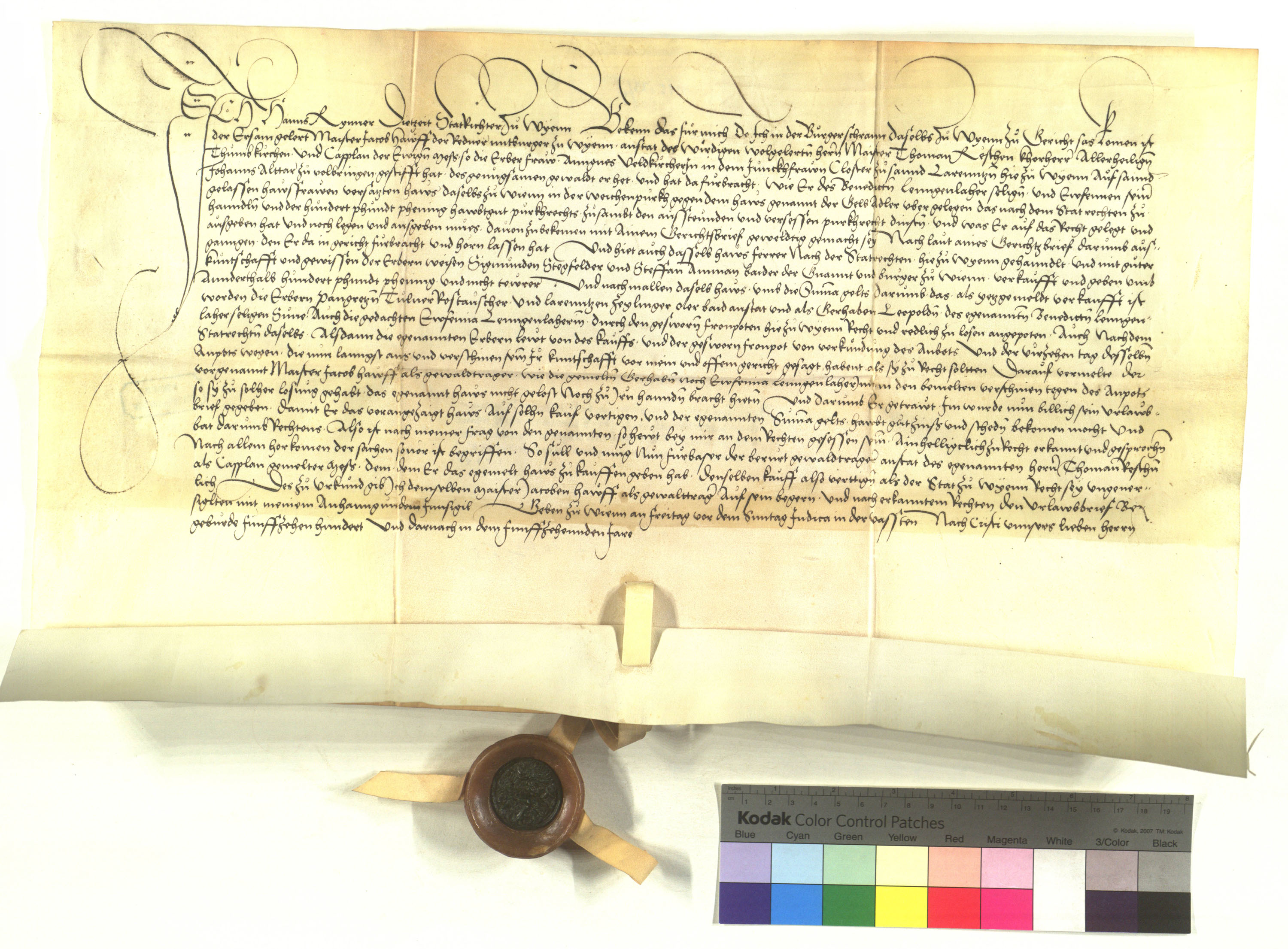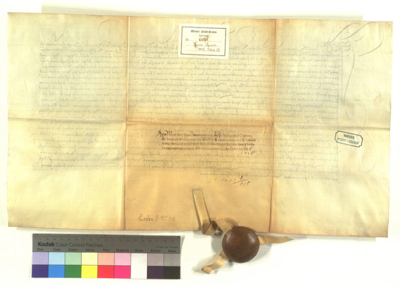 Archivangaben: 6071; AT-WStLA_HAUrk_6071; mit sehr gut erhaltenem Siegel im grünem Wachs an Pergamentpressel (IV C)ohne die dort erwähnte Ausfüllung. Aussteller gibt dem selben maister Jacoben Hawff den urlaubbrief, besiglten mit anhangundem innsigil. Rückaufschriften: 1. Herr Mert Reesschn thuembherrn zu S. steffan und caplan der Angnes Veldkhircherin stift zu S Larenntzen auf S. Johanns altar urlaub brieff uber Benedictn Lengenlahers haus in der Weyhenpurg gelegen datum usw. 1415ten - 2. Kasten B N ° 35 . - 3. Wr. Archiv 1/1515 .
