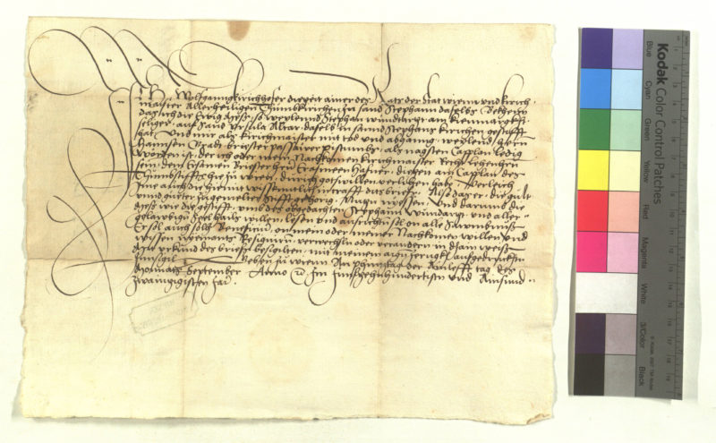 Wofganng Kirichhofer, derzeit eines des Rats der Stadt Wien und Kirchmeister von St. Stephan in Wien, verleiht die ewige Messe, die einst Stephans der Wundarzt am Kienmarkt auf St. Ursulaaltar in St. Stephan gestift hat und die der Aussteller als Kirchmeister mit dem Tod des Herrn Hannsen Gradt, Priester Passauer Bistums als nächsten Kaplan ledig worden ist, wovon er und seine nachkommenden Kirchmeister Lehensherren sind, dem Priester Herrn Erasmeen Hafner, derzeit ein Kaplan des Domstifts zu Wien unter den üblichen Vorbehalten.