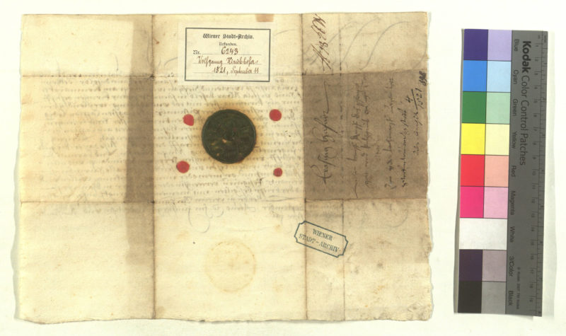 Archivangaben: 6243; AT-WStLA_HAUrk_6243; mit rückwärts aufgedrücktem Siegel in grünem Wachs (IV C): Im Schild Kirche, auf gekröntem Helm zwei Büffelhörner mit Pfauenwedeln in den Mundlöchern: S. Wo - lfgang - Kircho - ffer (auf Spruchband). Die Papierdecke nur mittels vier roten Wachsknötchen festgehalten.Siegler: Der Aussteller. Rückaufschriften: 1. Erasmus Hafner - Lehenbrieff auf das pfenigk gelt und Kalchgrub aigen2 zu Ottakring - Ein yeder zechmaister lechenher, - 2. Steffan Wundartzt stifft . - 3. N 18 K 6 W . - f, Wr. Archiv 4/1521. 5. 898.