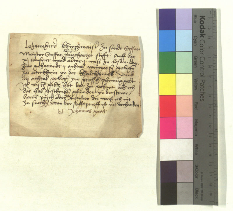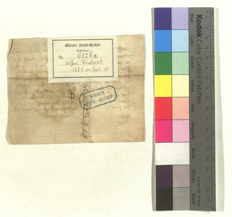 Kommentar: Geben zu Wienn, an phinztag der ainlefft tag des monnats september, anno etc im funfzehenhundertistn und ainundzwainzigisten jarr. (Datum: September, 11?); QGStW II/4, Nr. 6225a: Zettel, längere Zeit vor dem 11. September): 1521, jedenfalls längere Zeit vor dem 11. September: Ein bei no. 6243 liegender Zettel. Grundbuchauszug? Besagt folgendes: Lehensherr, Kirchmeister zu St. Stephan Meister Steffan, ehemals „puechartzt“ Stift auf dem Elftausend Jungfrauenaltar „j. mess zu lesen“: dazu gehören: „j. achtal“ Weingarten zu Ottakring („Aterkhrin“) „yn der Khalchgrueb“ und drei („iij“) Achtel gelegen „ym grossen phenniggelt“, auch sieben (vij) tl. „geltz“ hat dazu gehört, „als ich das hab geschriben gfunden yn der stewr herren puech oder register, die waiß ich nit zu suechen, wan der stift prieff ist nit verhanden“. Dr. Johannes Grat. Rückaufschrift: Steffan Wundarzt stift.51. dies durchgestrichen. Liegt bei 6243.